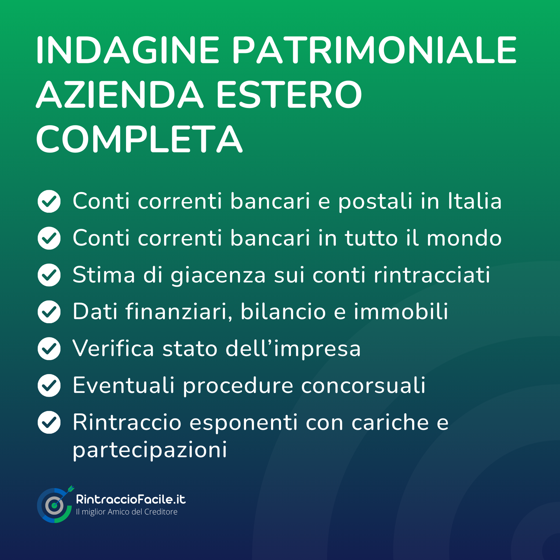 Indagine Patrimoniale Azienda Estero Completa è una ESCLUSIVA di Rintracciofacile.it ed è l’informativa che evidenzia in un documento completo e analitico la capacità patrimoniale di una IMPRESA in TUTTO il MONDO.